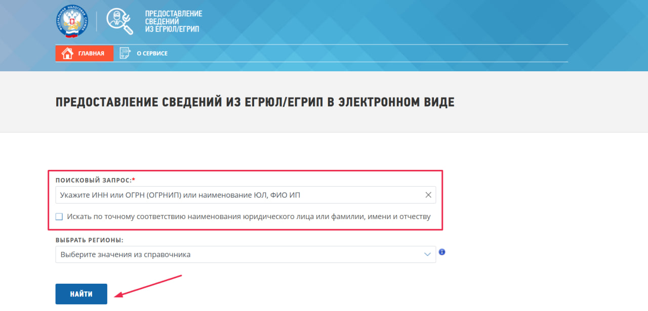 Чтобы узнать свой ОКВЭД, зайдите в сервис ФНС «Предоставление сведений из ЕГРЮЛ/ЕГРИП». Укажите информацию о себе в графе и нажмите кнопку «Найти».