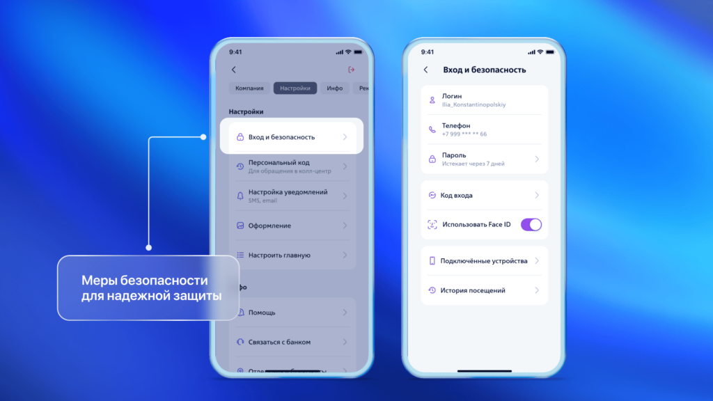 С ростом онлайн-операций увеличиваются и риски, поэтому наша платформа обеспечивает надежную защиту. В приложении реализована многофакторная аутентификация (биометрия, СМС-коды, Госуслуги), а также гибкая настройка прав доступа (например, бухгалтер видит платежи, но не может оформлять кредиты). Пользователи могут мониторить операции в режиме реального времени, а также увидеть список подключенных устройств аккаунтов и завершать нежелательные сессии.