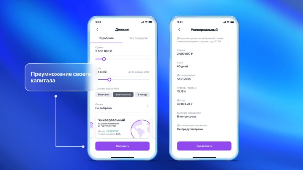 Мобильный банк входит в топ-3 лучших решений на рынке по версии Markswebb благодаря удобным кредитным и депозитным продуктам. Среди ключевых преимуществ — открытие депозитов в юанях, что становится выгодной альтернативой для предпринимателей, позволяя диверсифицировать валютный портфель. Кроме того, сервис предлагает лучшую на рынке практику, также отмеченную Markswebb, — перевод процентов с депозита на счёт в другом банке.