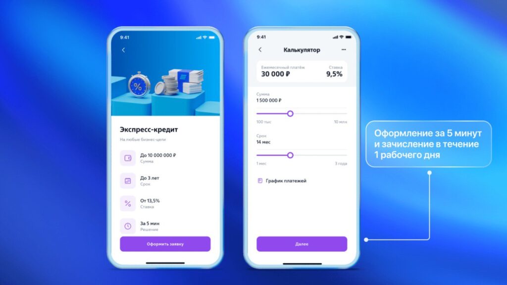 В приложении доступны экспресс-кредиты с одобрением всего за 5 минут и зачислением средств в течение 1 рабочего дня. Условия полностью прозрачны: в мобильном банке отображаются все доступные кредитные продукты, лимиты и графики погашения. Клиенты могут управлять кредитами в режиме полного цикла — от подачи заявки до досрочного погашения или запроса нового транша.