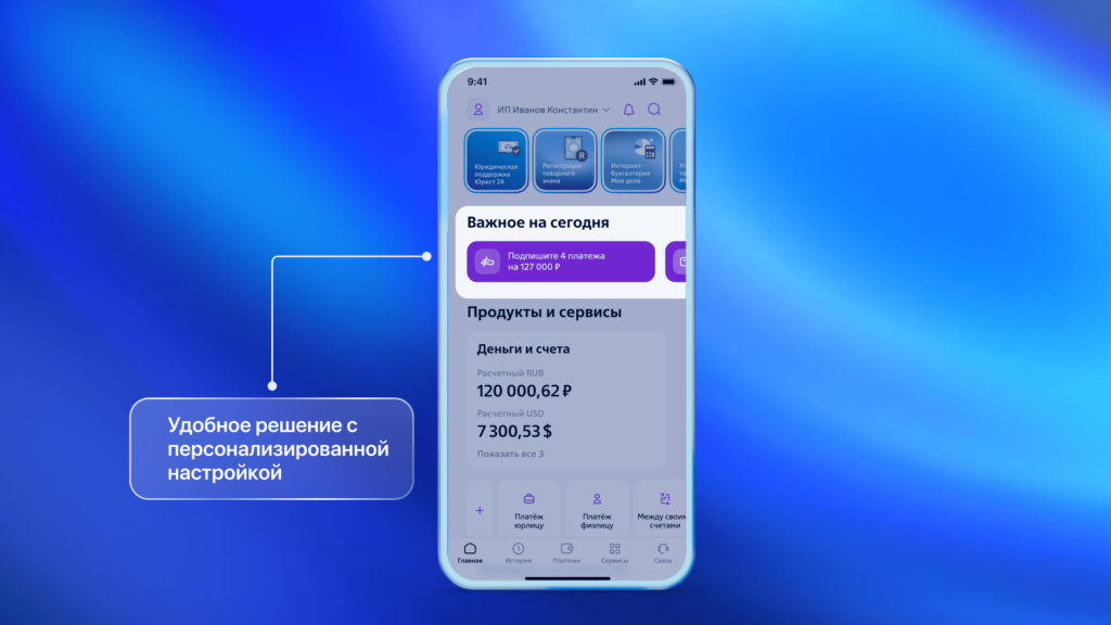 Мобильное приложение Бизнес Платформа ВТБ позволяет настраивать главный экран под свои нужды. Например, в виджете «Важное на сегодня» в одном месте собраны вся ключевая информация: предстоящие платежи, поступления средств, сроки отчетности. Также доступно гибкое управление быстрыми действиями — можно вынести часто используемые операции (переводы, уплата налогов, проверка баланса) на главный экран, а с помощью адаптивного дизайна пользователь сам выбирает доступные варианты по визуальному оформлению.