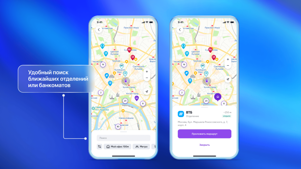 Поиск быстрого поиска ближайшего банкомата или офиса банка с отображением расстояния непосредственно в мобильном банке отмечена Markswebb как must-have функционал. Это делает взаимодействие с банковскими услугами быстрее и комфортнее.