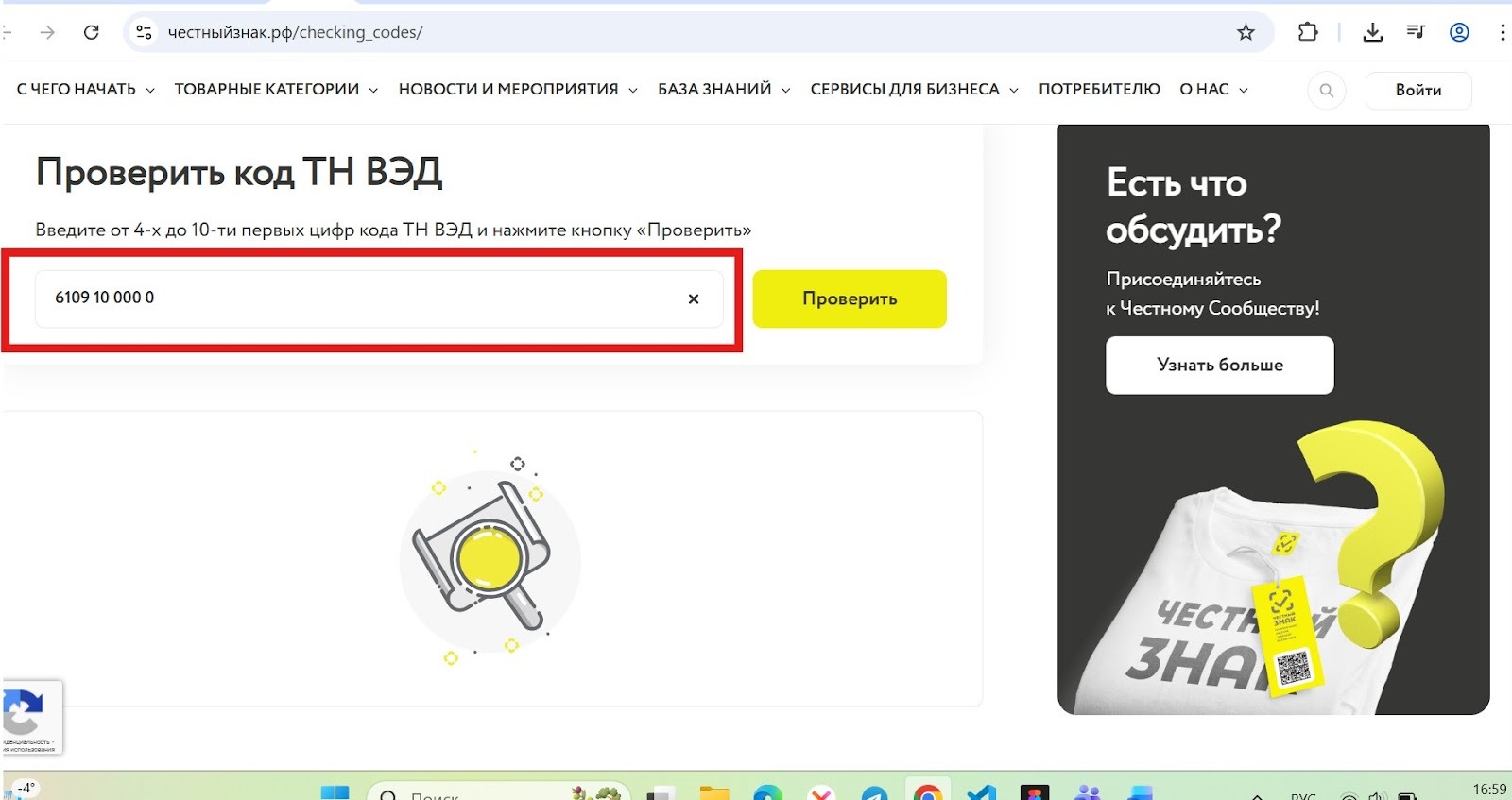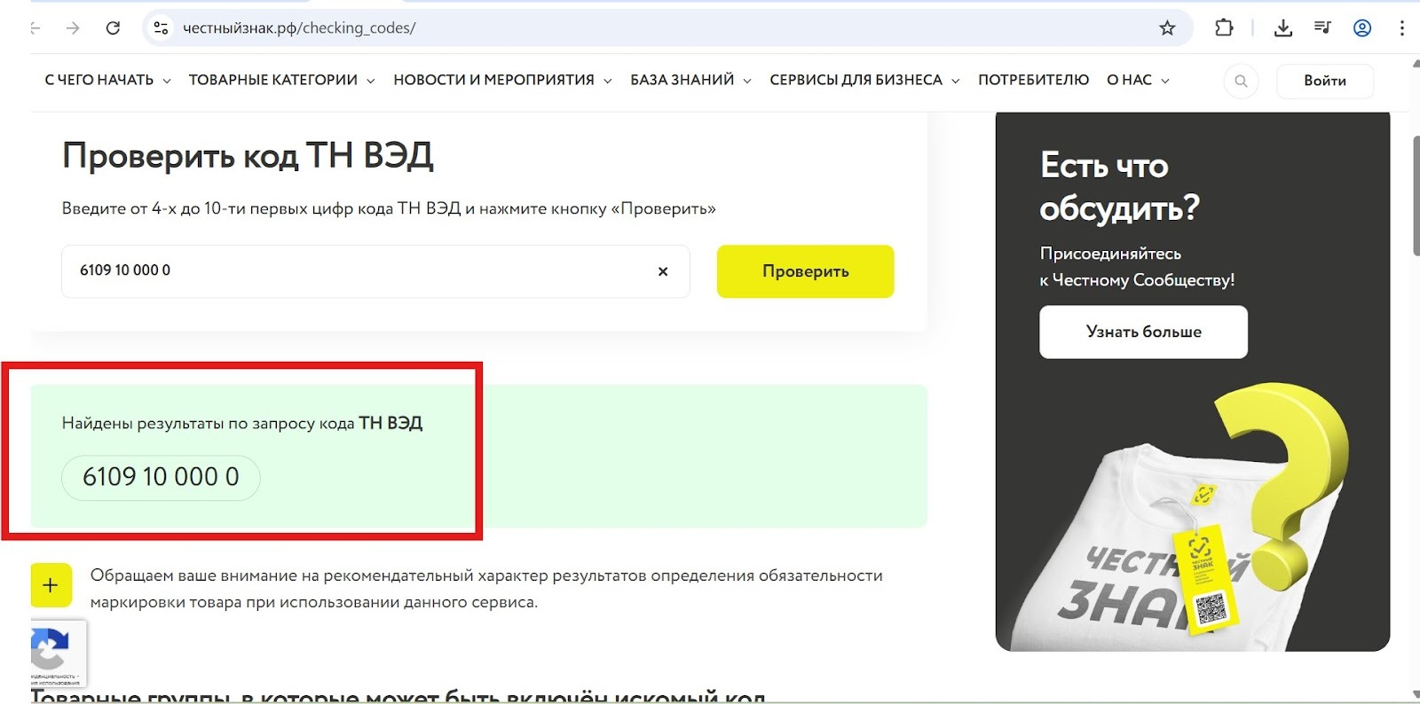 Например, вы продаете хлопковые футболки. Для них используется код ТН ВЭД 6109100000. Введите этот номер в поле проверки и нажмите кнопку «Проверить».