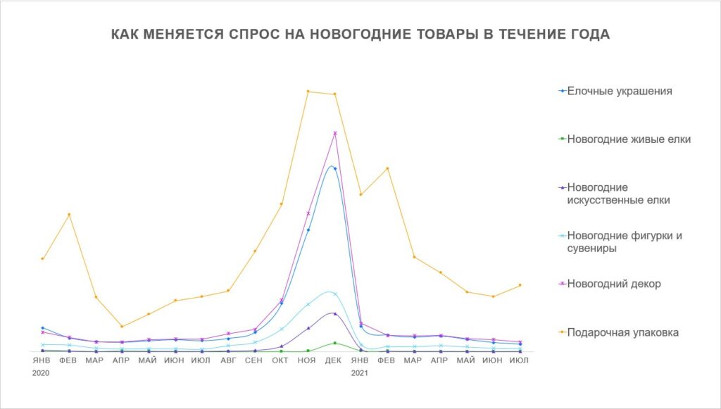 Продажи многих зимних товаров начинают расти осенью, или даже в конце лета. Например, именно так меняется спрос на спортивный инвентарь. А что же новогодние товары? Выясним, когда и с каким новогодним ассортиментом стоит выходить на маркетплейс и узнаем, как продавцам порадовать всех: покупателей — интересными товарами, а себя — дополнительными продажами.