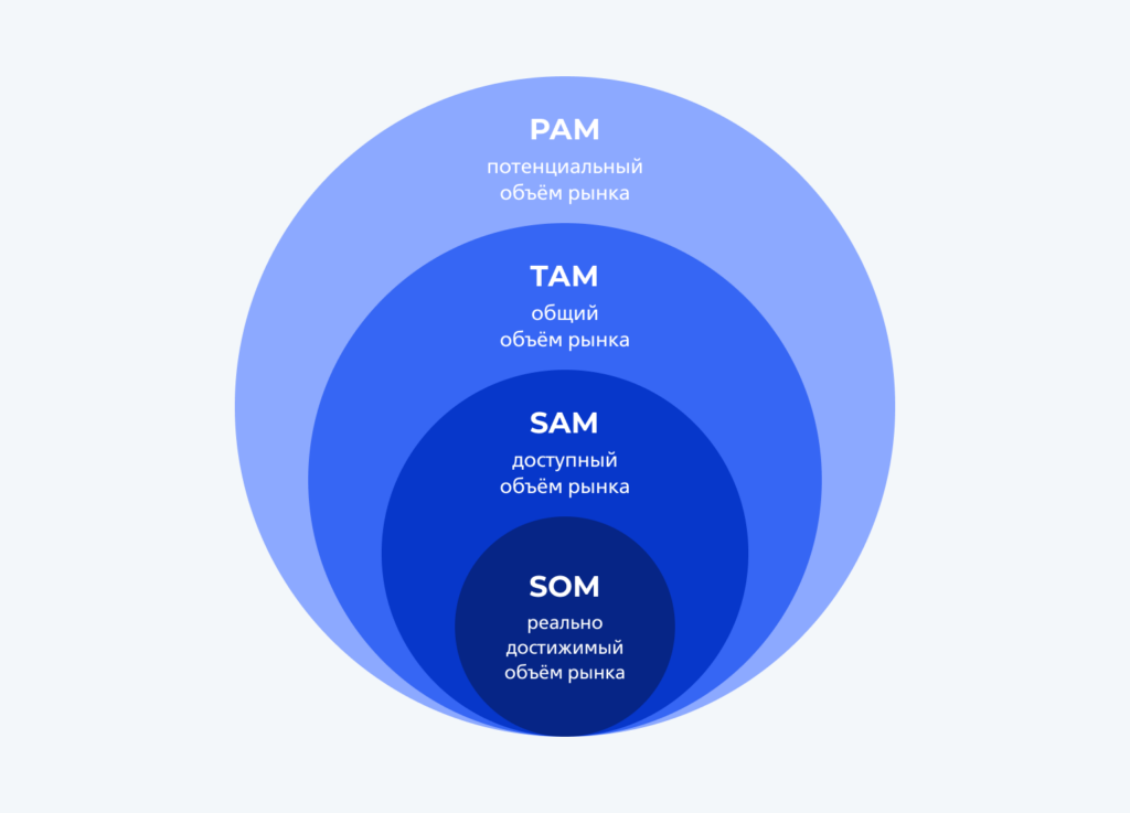PAM, TAM, SAM и SOM — это показатели рынка, каждый из которых соответствует своему сегменту. Это позволяет оценить объём рынка, перспективы роста компании, список конкурентов и прочее.