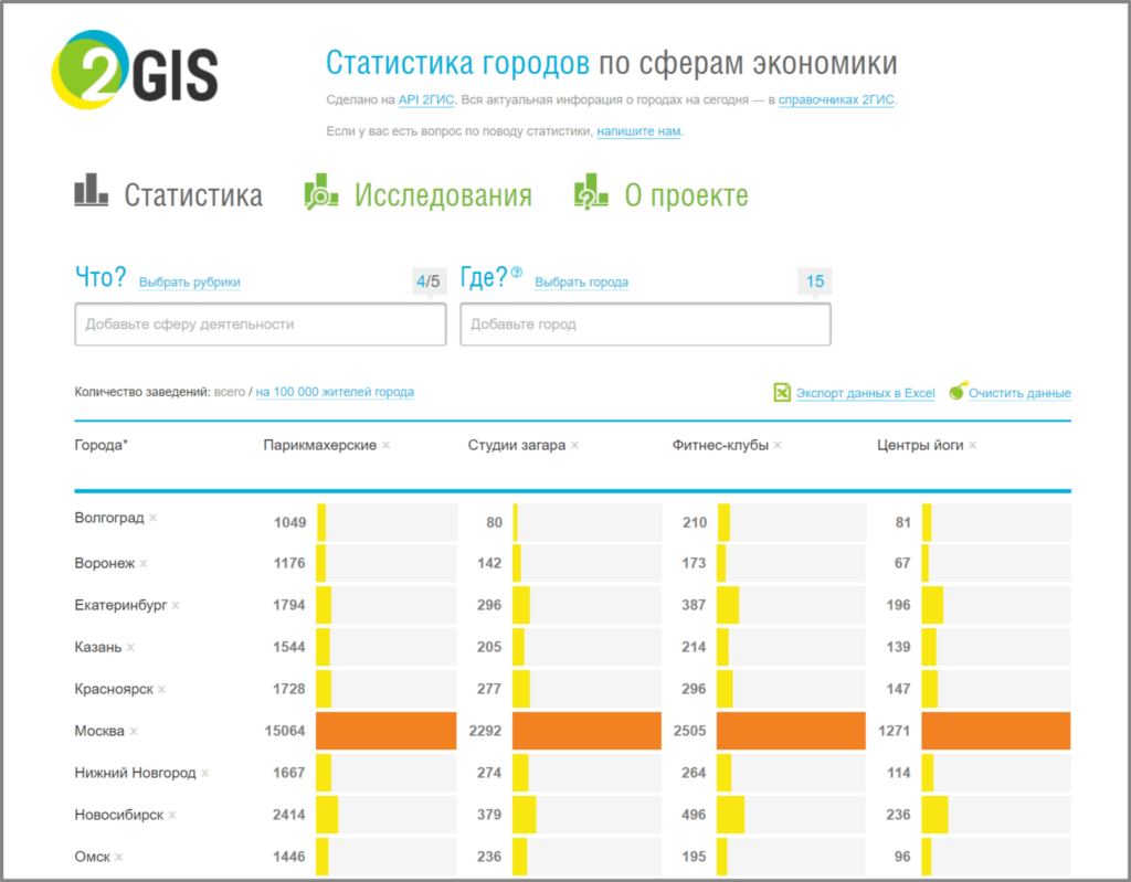 - Статистика городов по сферам экономики и другие исследования от компании «2ГИС» — электронного справочника с картами городов.