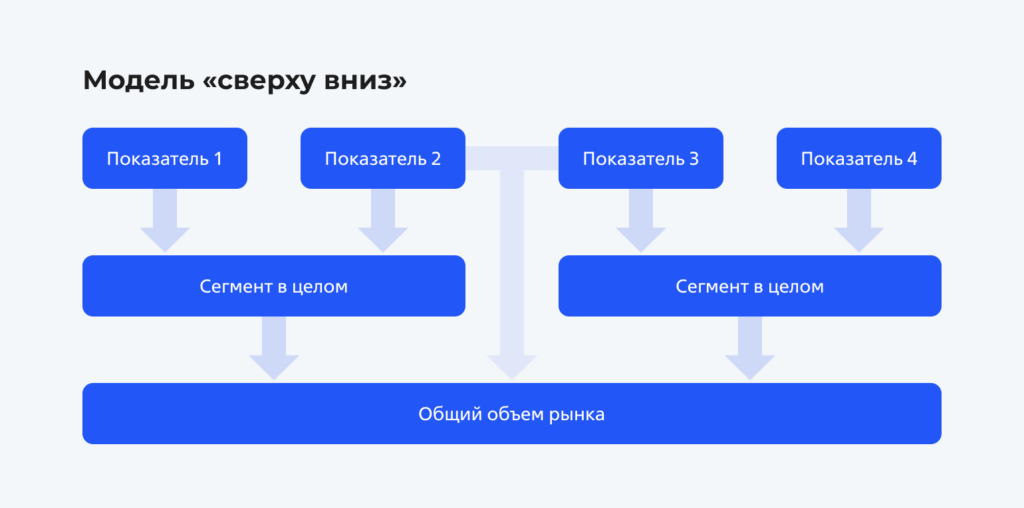 - Для оценки показателей сегмента рынка используются два способа: «сверху вниз» и «снизу вверх». Первый способ проводится на основе аналитических данных касательно ситуации на рынке, а второй — на основе маркетинговых данных, воронки продаж и протестированных гипотез.