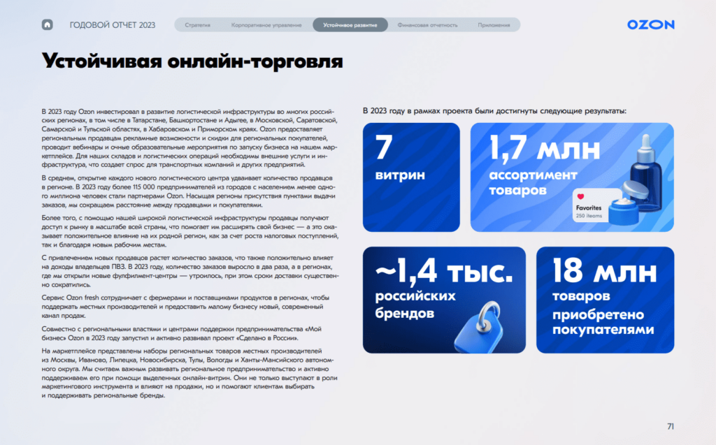 В качестве примера приведём статистику из годового отчёта за 2023 год от маркетплейса OZON. Например, можно увидеть, сколько российских брендов конкурируют на этом сайте, сколько покупателей совершили покупки. В данном примере, это фактический объём рынка (SOM).