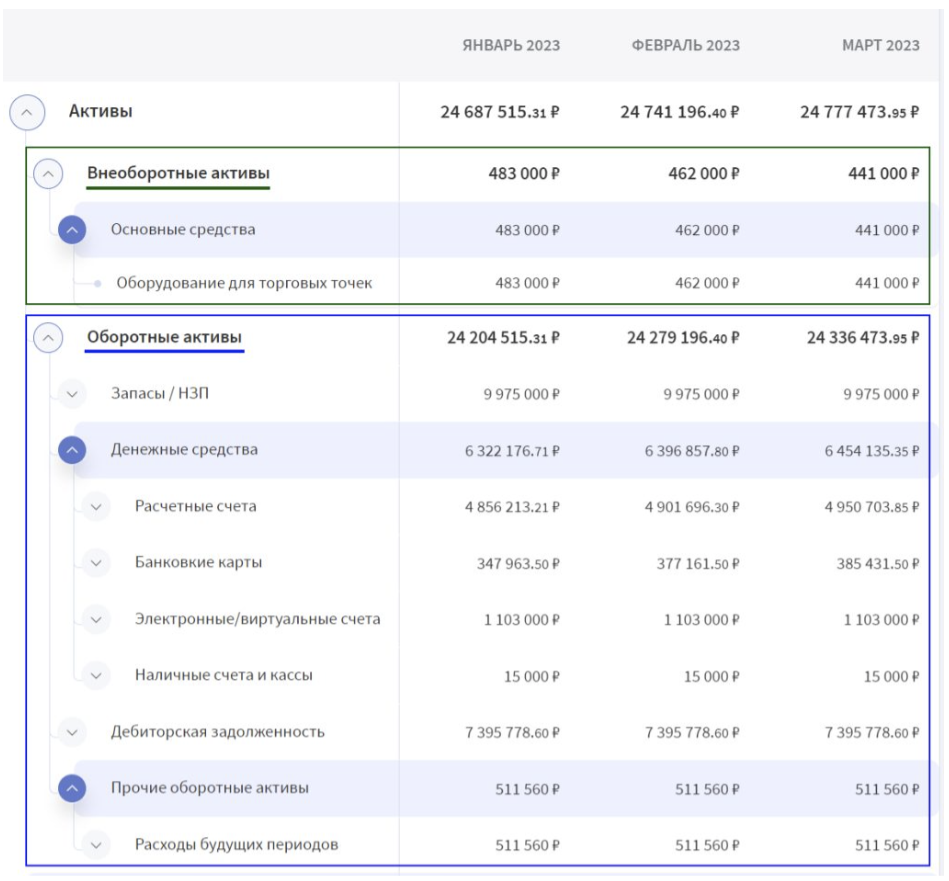 В активах отражают всё, чем владеет компания: деньги на счетах, оборудование, товары на складе и всё остальное, что можно реализовать за деньги. Пример разделения активов в управленческом балансе в Финтабло: