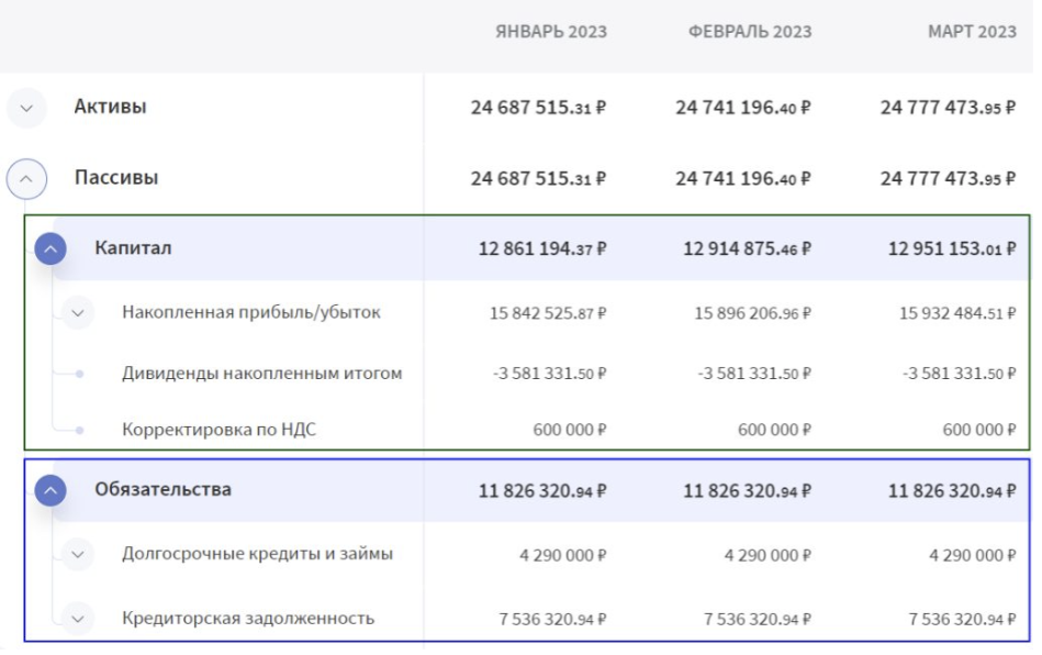 - Капитал — сюда относят накопленную прибыль или убыток, дивиденды и корректировки по НДС.