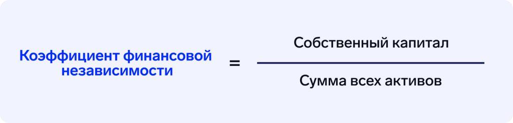 Необходимо отслеживать зависимость компании от кредиторов — этот параметр называется «Коэффициент финансовой независимости». Формула для расчёта: