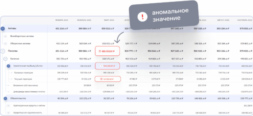 Финтабло формирует управленческий баланс автоматически на основе данных в системе. В случае выявления аномальных значений система подсвечивает аномалию. Это упрощает поиск неточностей: