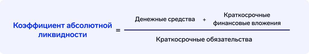 2. Абсолютная — даёт понимание о финансовых возможностях компании незамедлительно частично погасить краткосрочные обязательства. Формула: