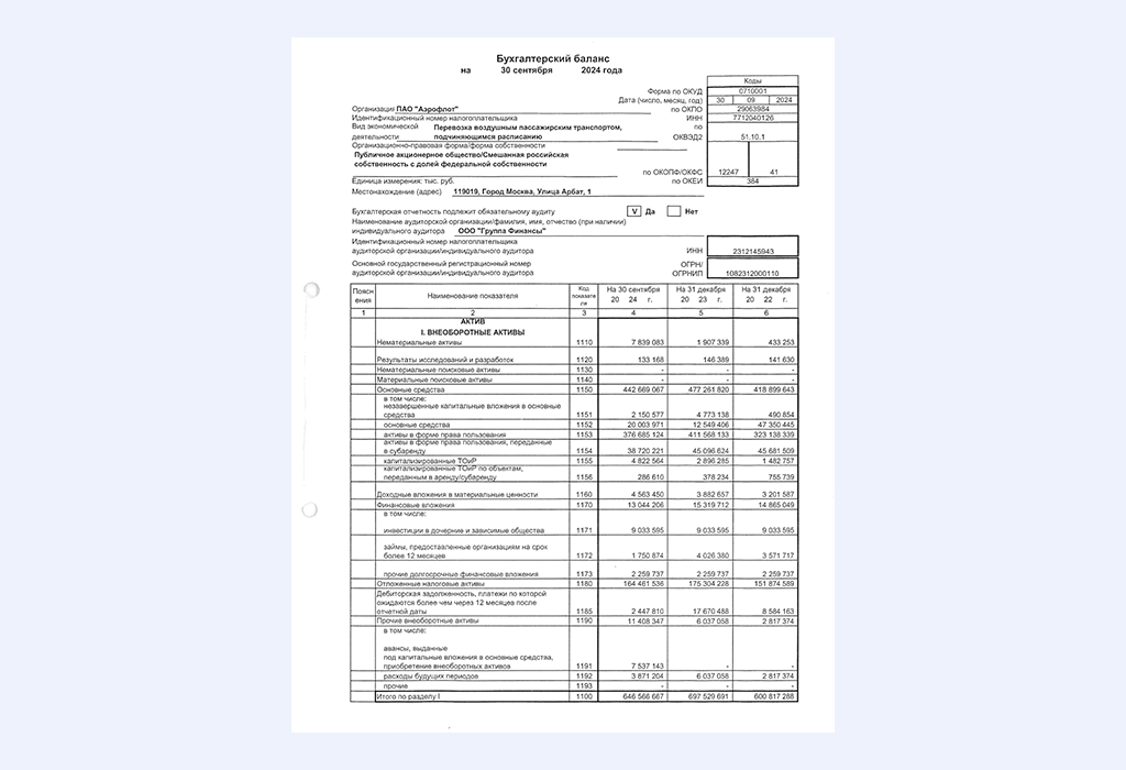 Для примера рассмотрим бухгалтерский баланс ПАО «АЭРОФЛОТ», который открыто публикуется на официальном сайте: