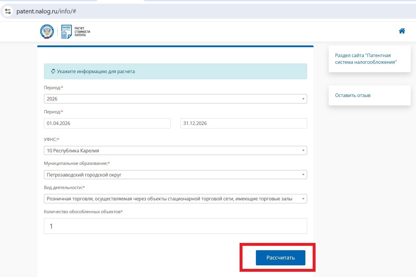 В нашем примере мы рассчитали стоимость разрешения для одного магазина, работающего в городе Петрозаводске, Республика Карелия. Периодом работы указали даты с 01.04.2026 по 31.12.2026. Вот как это выглядит в калькуляторе: