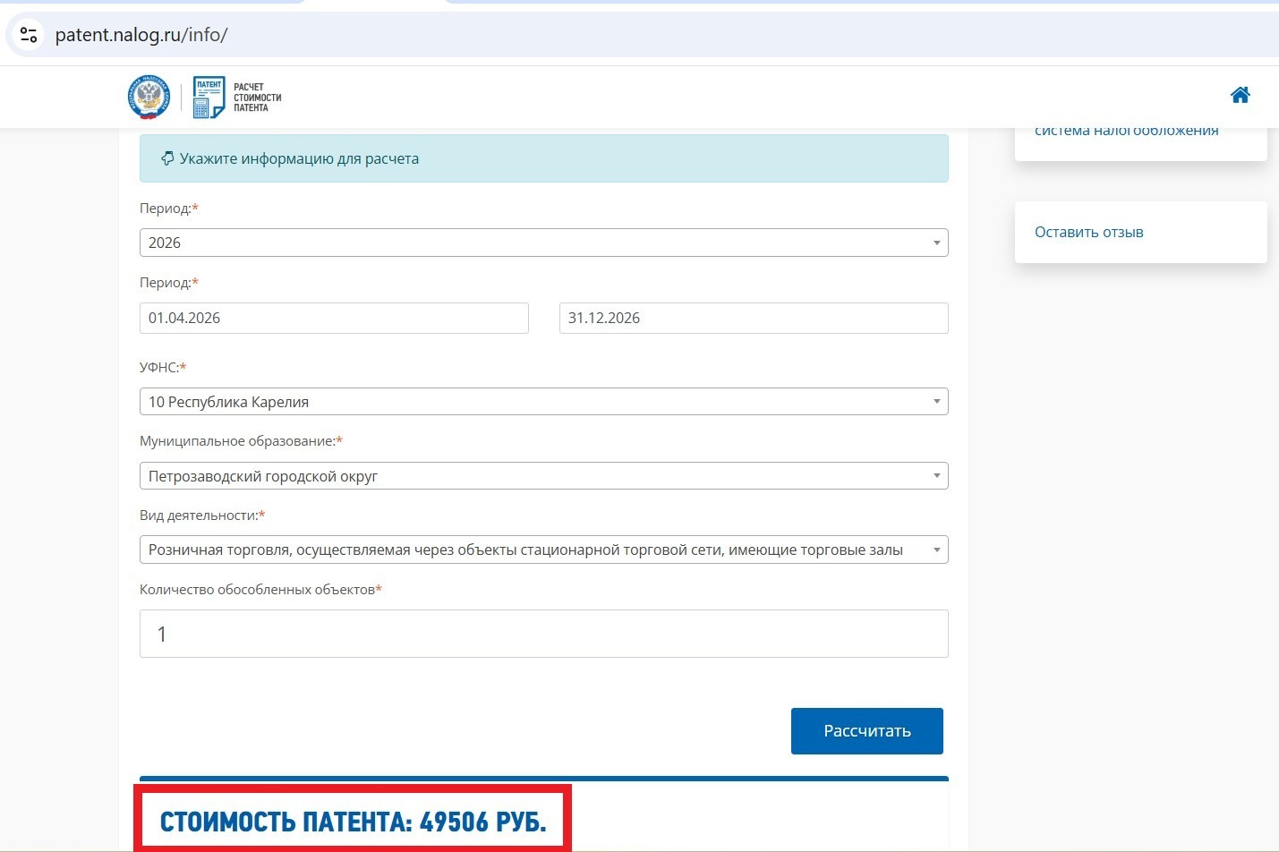 Укажите в нем данные о своем магазине, сервис сам покажет сумму налога. Предположим, вы хотите получить разрешение на работу магазина по ПСН в городе Петрозаводск, Республика Карелия. Вот какие сведения нужно указать в калькуляторе: