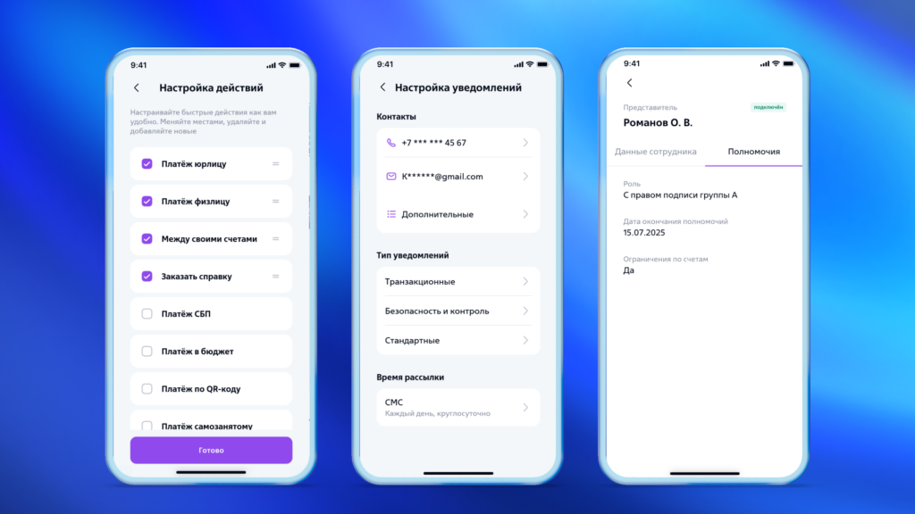 Система разграничения прав доступа позволяет гибко настраивать уровень авторизации для каждого сотрудника в соответствии с его задачами и должностными обязанностями. Например, бухгалтеру может быть предоставлен доступ только к платежам без возможности просмотра аналитики доходов, а менеджеру по кадрам — исключительно к зарплатному проекту для формирования реестров выплат. Все действия пользователей фиксируются в системе с указанием времени и даты, что обеспечивает полный контроль над операциями и помогает предотвратить мошеннические действия. Интеграция с системами электронного документооборота позволяет сотрудникам подписывать документы без доступа к другим банковским операциям. Данный подход обеспечивает безопасность и масштабируемость: при росте бизнеса можно добавлять новых сотрудников и настраивать их права, не меняя основные процессы, а настройки сохраняются даже при смене рабочего устройства.