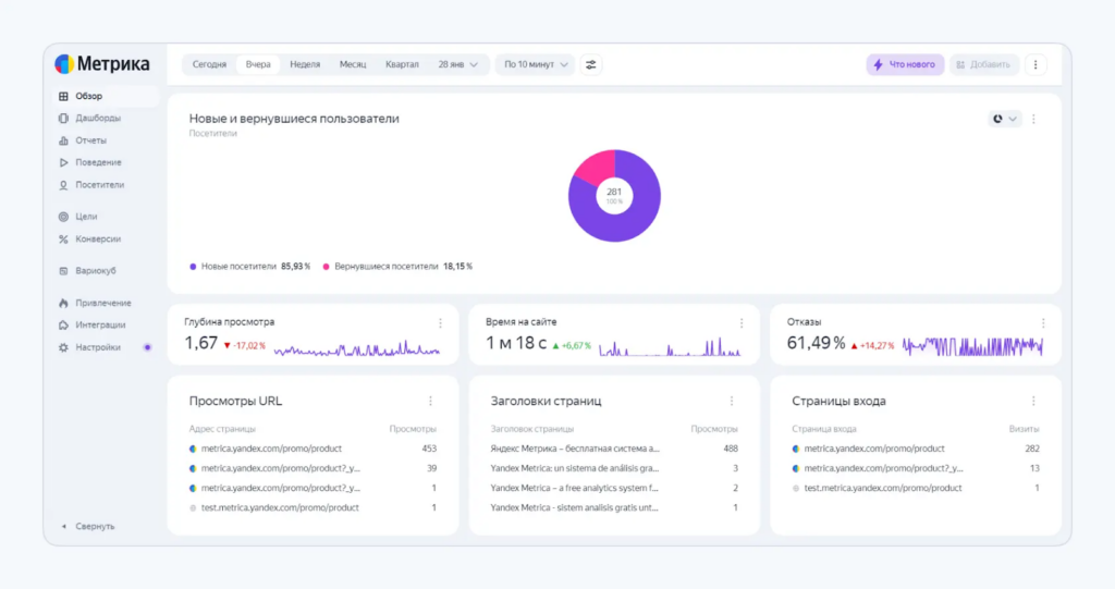 В «Яндекс Метрике» посмотреть данные можно в разделе «Дашборды», вкладка «Сводка».