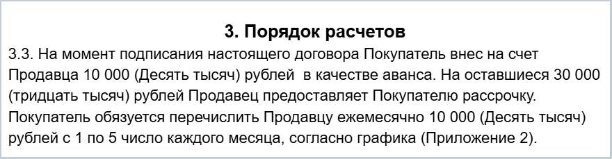 ✅ При оплате в рассрочкув договоре указывают сумму, которую заказчик оплатил сразу, и составляют график оплаты оставшейся суммы.