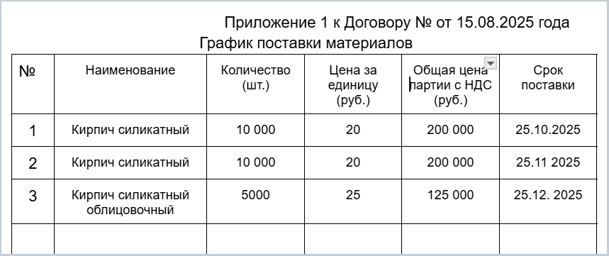 В графике поставки товаров партиями или этапов выполнения работ указывают стоимость, сроки поставки или выполнения.