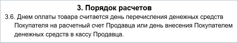 Важно.Нужно указать в договоре момент, который стороны считают окончанием расчета. Это может быть факт поступления денег на счет исполнителя или факт того, что заказчик перечислил деньги. Иногда они не сразу поступают на счет поставщика, и он может решить, что условие по сроку оплаты нарушено.