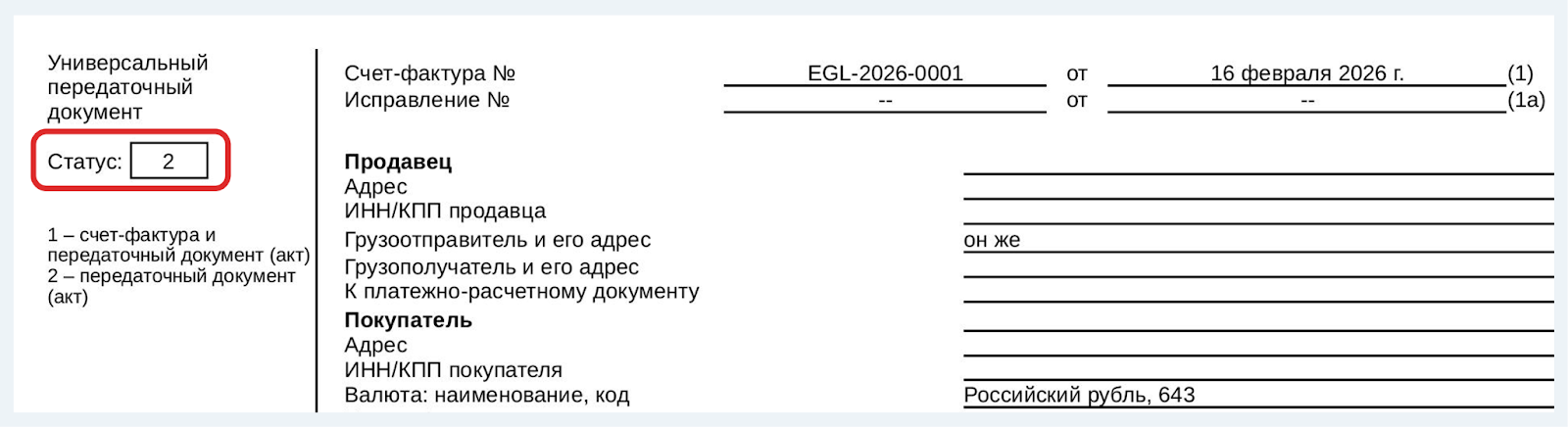 - Определите статус УПД в зависимости от того, нужна ли счет-фактура. Если да — укажите статус 1, если требуется только накладная или акт — статус 2.