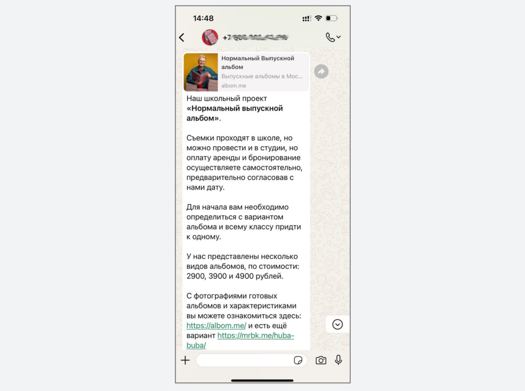 Пример. Компания проводит фотосессии и делает выпускные альбомы. Клиенты с сайта могут сразу перейти в WhatsApp и начать общение с менеджером. В ответ на вопрос «Как проводится съёмка и сколько стоят альбомы» сотрудник отправляет шаблон с основной информацией об услугах и условиях сотрудничества.