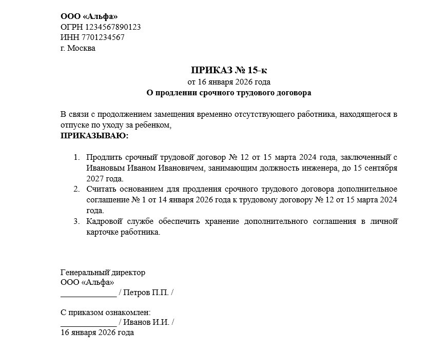 Шаг 4. При необходимости оформите внутренний приказ о продлении трудового договора