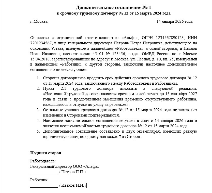 Например, когда речь идет о замещении сотрудника в декрете, соглашение продлевают до конца отпуска, то есть до достижения ребенком трехлетнего возраста.