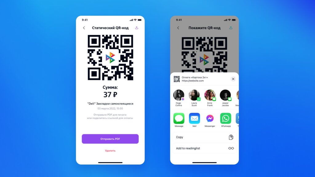 Клиент может самостоятельно и быстро сгенерировать статический QR-код и делиться им с контрагентами. При создании необходимо ввести назначение платежа и стоимость. После совершения оплаты подтягиваются все детали по операции: