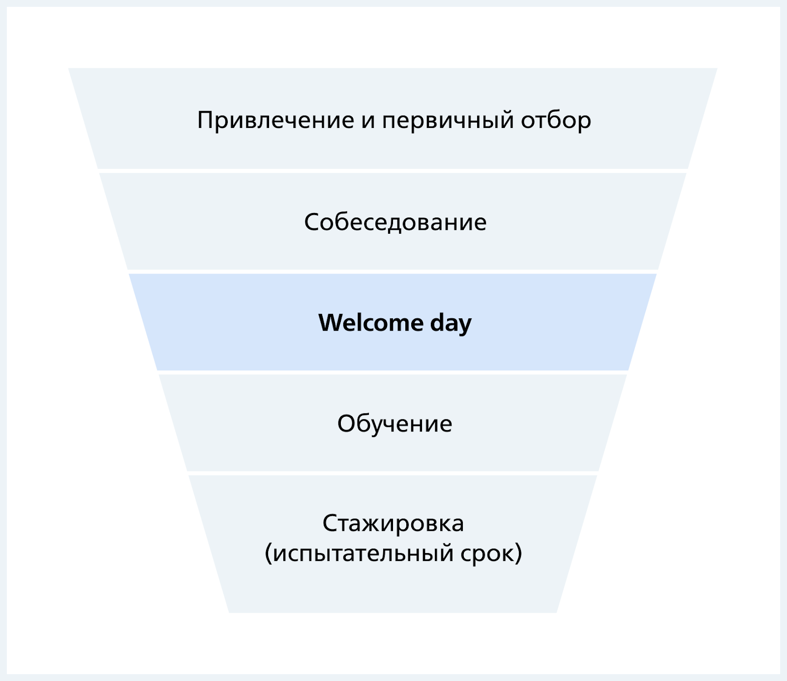 Чтобы исправить ситуацию, перед обучением в компании решили создать для кандидатов эффект присутствия на рабочем месте. Назвали его welcome day — тестовый день. Сейчас воронка найма выглядит так: