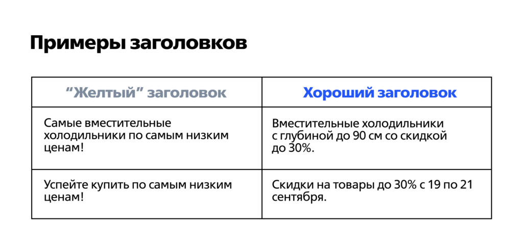 «Жёлтые» заголовки искажают и подтасовывают содержащиеся в тексте факты. Заголовки на сайте должны привлекать внимание, а не раздражать: крикливые восклицательные знаки могут отпугивать покупателя не меньше, чем сомнительные предложения с непонятной механикой акций.