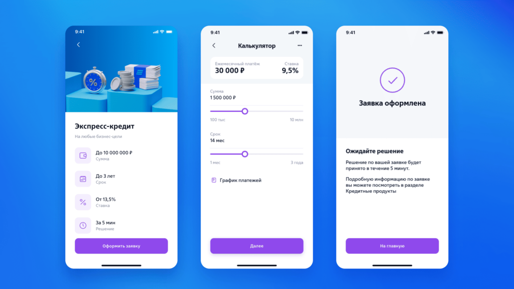 О развитии бизнеса тоже не забыли. Экспресс-кредиты — это быстрое кредитное решение на любые бизнес-цели в онлайн-режиме. В приложении Бизнес Платформа ВТБ теперь тоже можно оформить заявку за 5 минут через маркетплейс или виджет кредитных продуктов, а в течение одного рабочего дня получить зачисление денежных средств на выбранный счёт. Без залога и документов, с быстрым одобрением и зачислением.