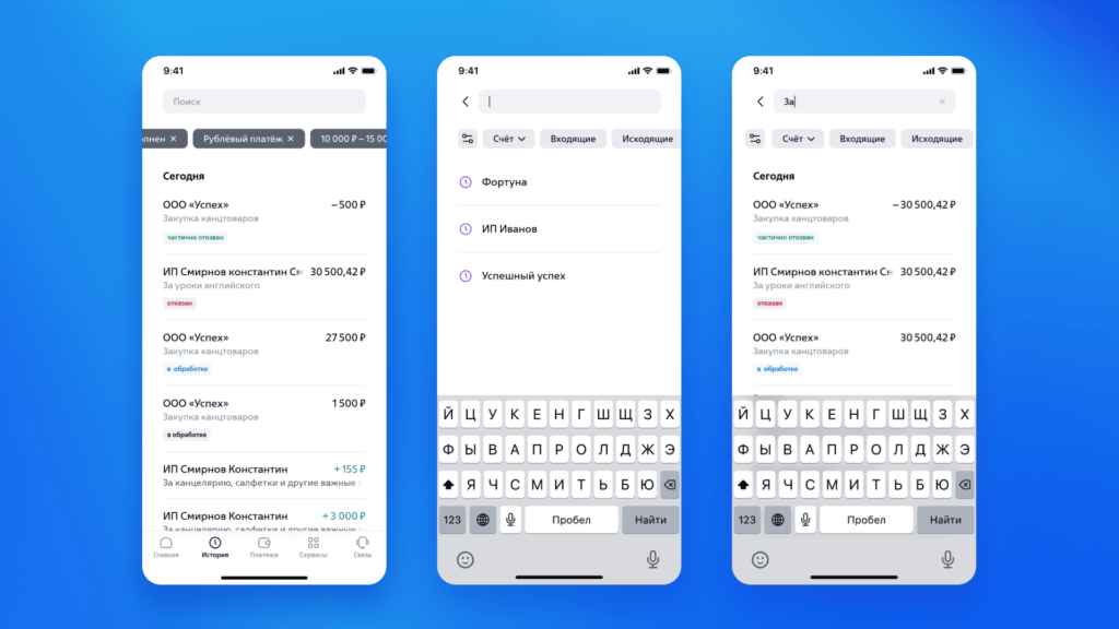 Новые доработки осуществлялись и в одном из основных разделов мобильного банка — истории операции, в которой отображаются входящие и исходящие транзакции по счёту. Тут появилась сортировка с просмотром общего количества и суммы, а также автоподстановка слов из ваших операций или отображение последних запросов при поиске в разделе. Это существенно упрощает настройку параметров и общий поиск по совершенным или полученным платежам.