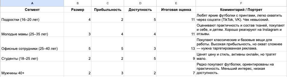 Группы, у которых большая сумма оценок по всем критериям — целевые сегменты. Подробно опишите усредненный портрет клиентов из этих групп и делайте упор в рекламе на них. С остальными тоже можно взаимодействовать, но тратить меньше времени, денег и усилий.