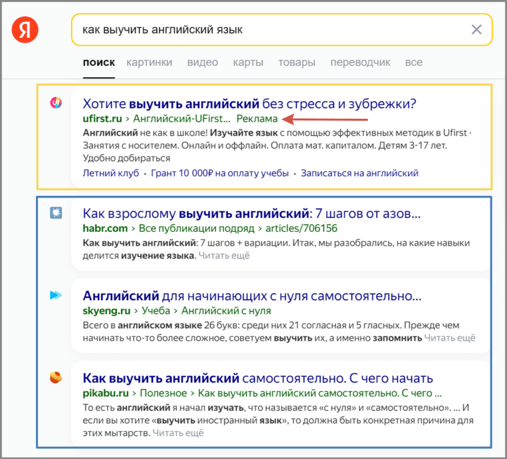 Чтобы разобраться в основных терминах, сначала вспомним, как выглядит процесс поиска информации. Например, вы мечтаете выучить английский язык, но не решили, будете ли вы заниматься им самостоятельно или с преподавателем. Вы заходите в Яндекс и начинаете искать нужную информацию. В первых строчках будут появляться платные рекламные объявления. После них вы увидите список обычных статей и страниц. Как это выглядит, вы можете посмотреть на скрине ниже.