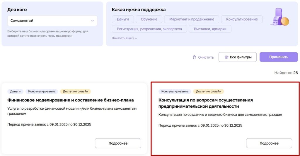 Ещё один способ — оформить меру поддержки «Консультация по вопросам осуществления предпринимательской деятельности».