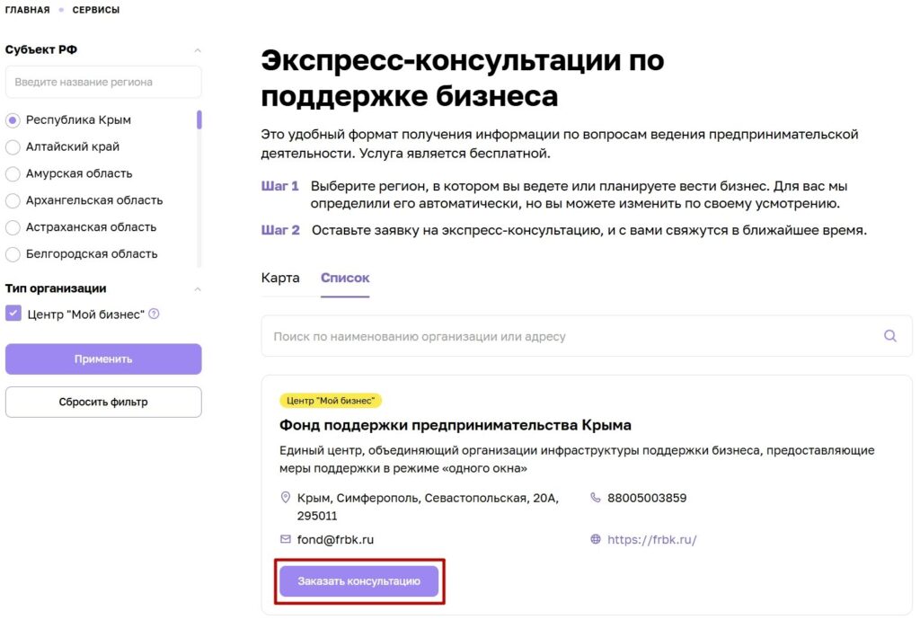 1. Перейдите на страницу услуги «Экспресс-консультации по поддержке бизнеса» и выберите регион «Республика Крым».