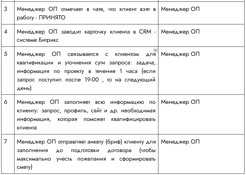 - дорожная карта, в которой прописан путь клиента и этапы взаимодействия: от запроса до передачи в отдел производства и реализации обязанностей по договору;